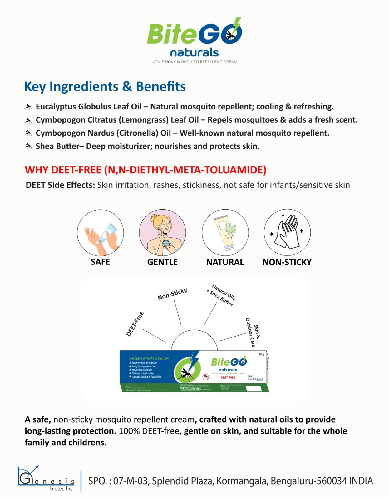 Stay protected from mosquitoes the safe and natural way with BiteGo Naturals Mosquito Repellent Cream. Specially formulated to provide up to 8 hours of effective protection, this gentle, skin-friendly cream creates a protective barrier that helps prevent mosquito bites without the use of harsh chemicals.