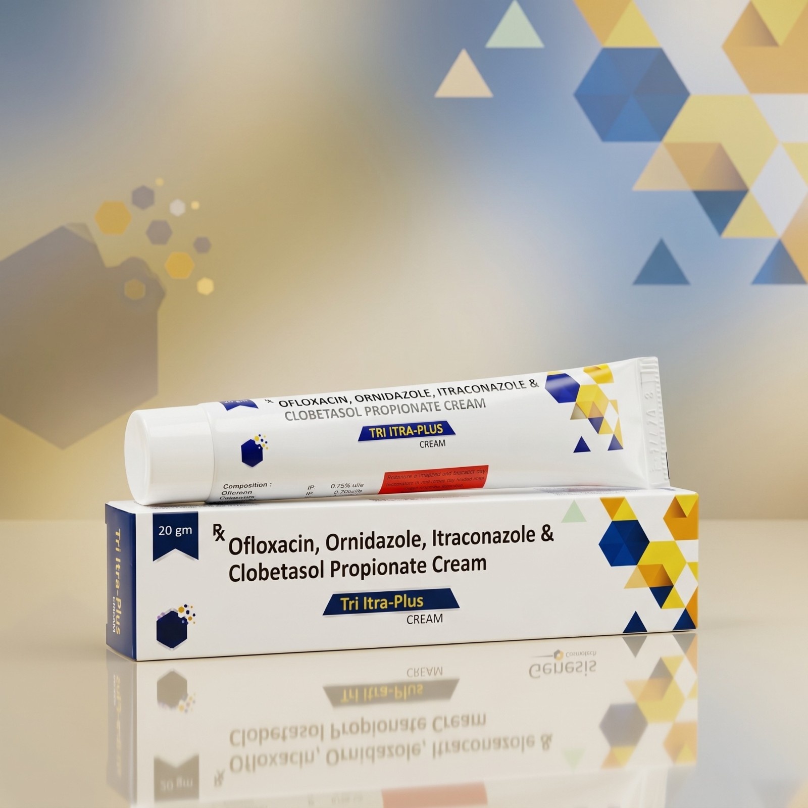 TRI-ITRA PLUS is a potent topical formulation combining Ofloxacin, Ornidazole, Itraconazole, and Clobetasol Propionate. It effectively targets bacterial, fungal, and protozoal infections while reducing inflammation and itching, promoting faster healing, and restoring healthy skin with comprehensive antimicrobial and anti-inflammatory action.
