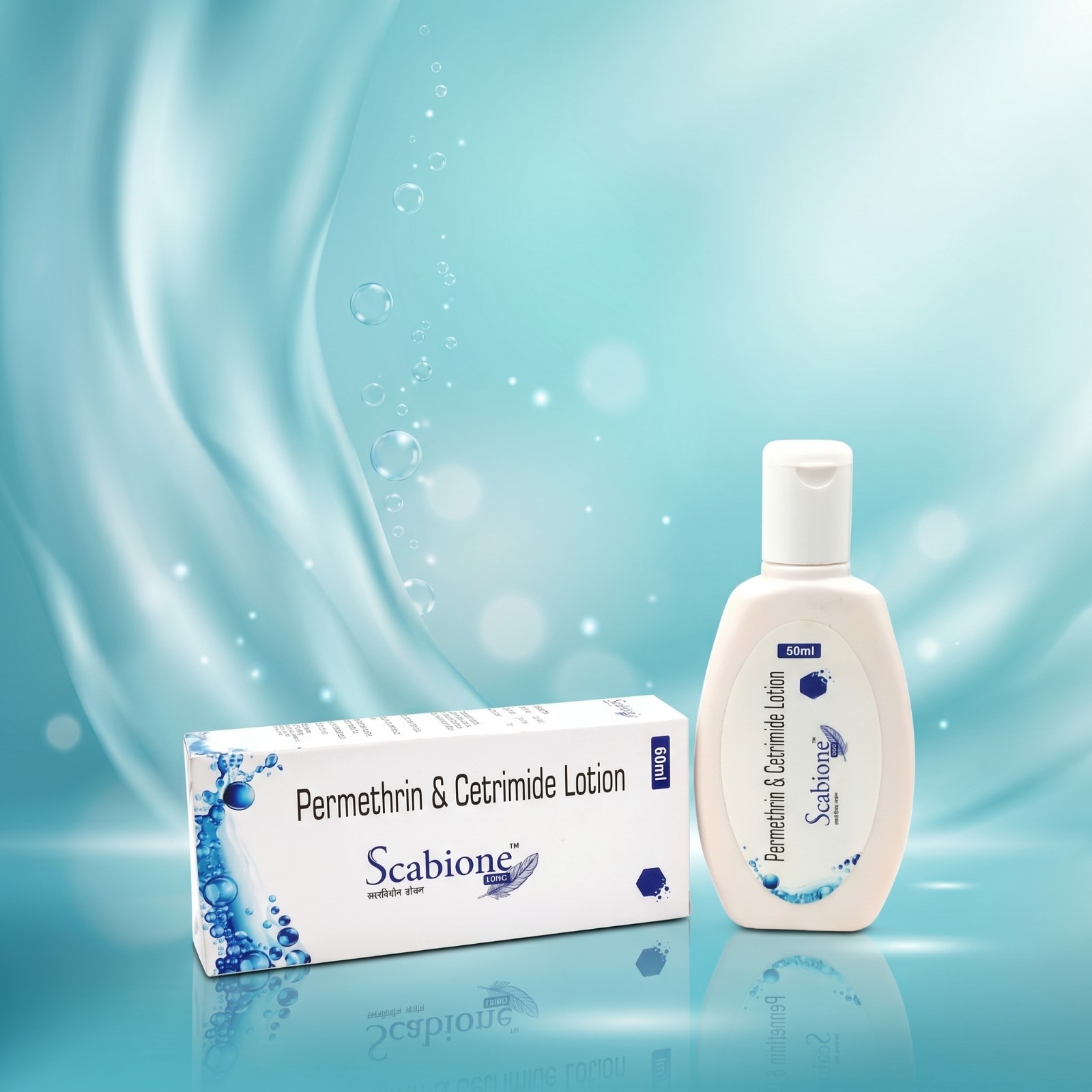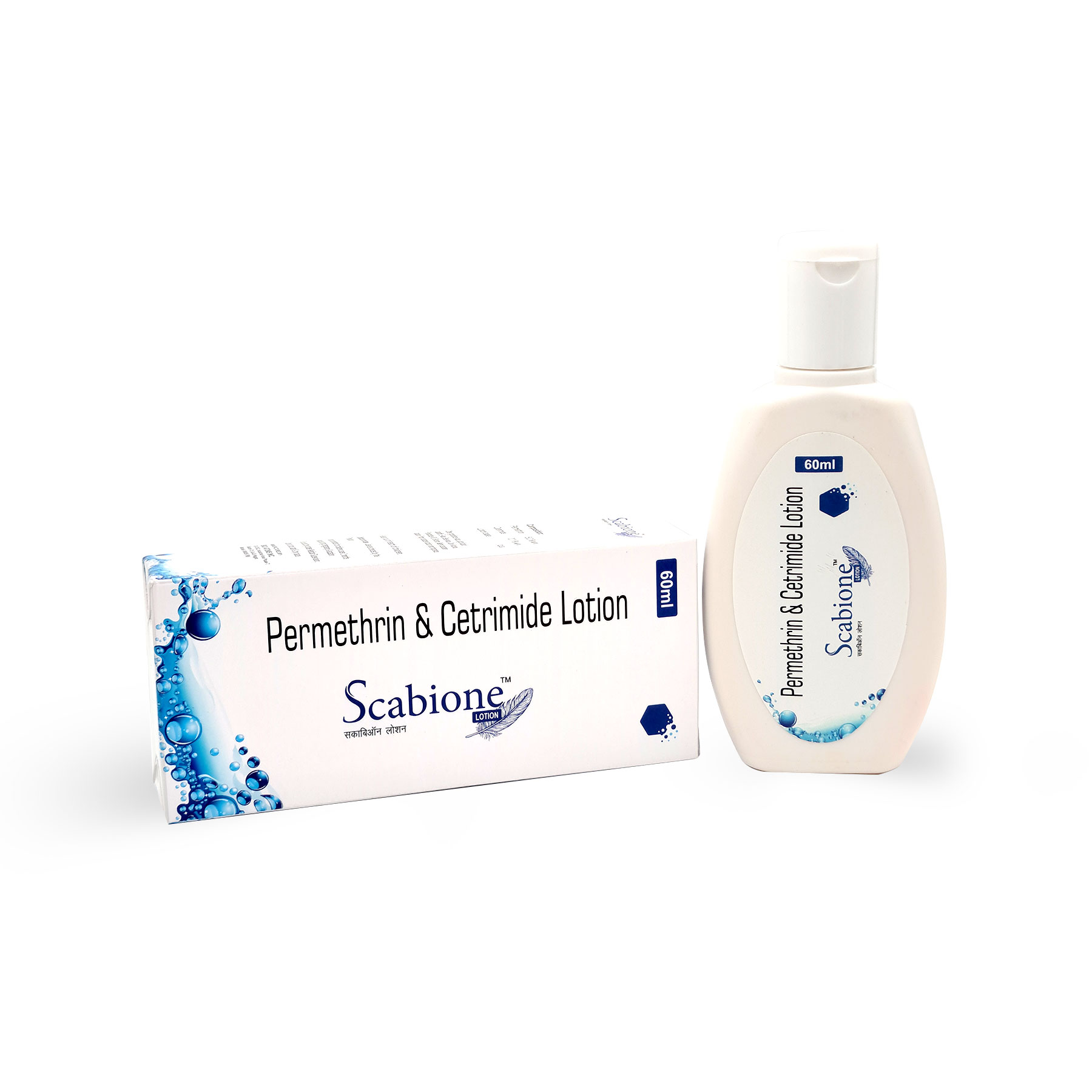 SCABIONE Lotion combines Permethrin 5% w/w and Cetrimide to effectively eliminate scabies mites, soothe itching, and prevent secondary infections. Its fast-acting formulation provides relief from irritation, reduces inflammation, and promotes healthier skin, ensuring safe and efficient treatment for scabies.
